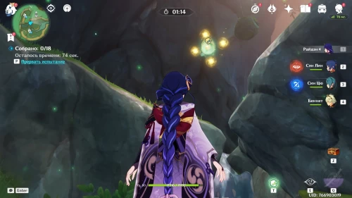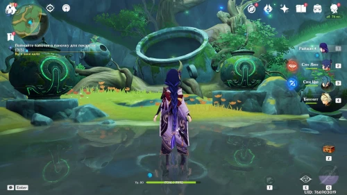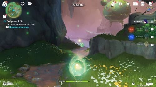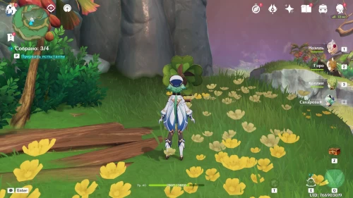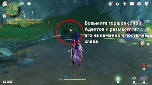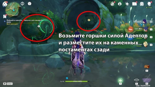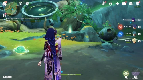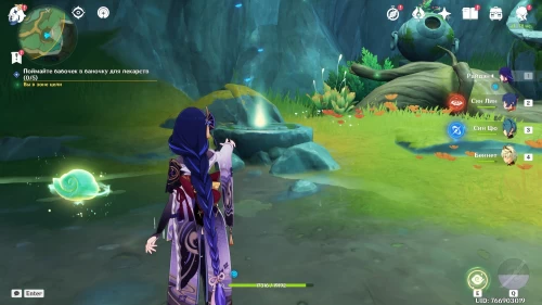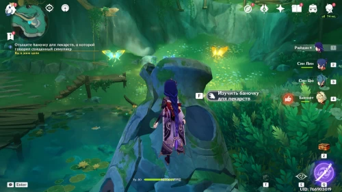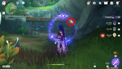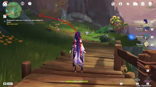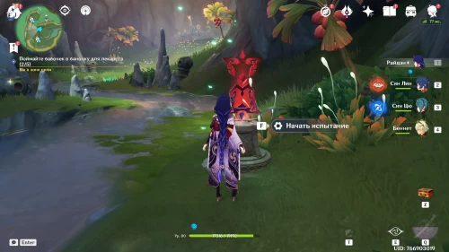 Подойдите к кувшину, вокруг которого порхают фиолетовые бабочки, и взаимодействуйте с ними для старта испытания. Вам нужно будет поймать разлетевшихся бабочек.