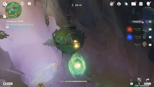 Вам предстоит собрать 18 Гео частиц за 80 секунд. Для этого развернитесь и воспользуйтесь прыжком золотого карпа, чтобы притянуться к водяной жемчужине наверху. Направьте прицел ко второй жемчужине внизу и активируйте ее. Вы превратитесь в карпа и начнете лететь вверх, автоматически подбирая частички.