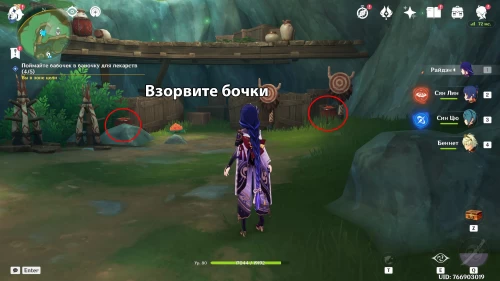 Взорвите красные бочонки для удаления паутины и пройдите под аркой в просторное помещение. Идите вглубь него к коробкам и мишеням в виде хиличурлов – выстрелите по красным бочкам (или просто ударьте), чтобы появились враги.
