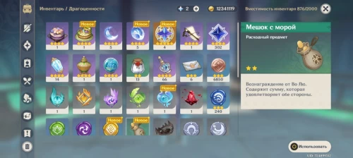 Также вы получите от Во Лю мешок с морой, который можете оставить на память или использовать, чтобы получить 6000 моры. Найти награду от гидролога можно в инвентаре, в разделе «Драгоценности».