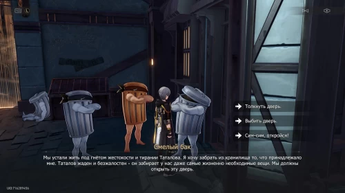 Сразу после разговора с Шатаной, пройдите вперед, и вы увидите Смелый бак, пытающийся войти в дверь. Подойдите и поговорите с ним. Он попросит вас помочь ему отворить дверцу. Выберите любой вариант, так как вам все равно удастся открыть проход. В награду вы получите доказательство доверия.