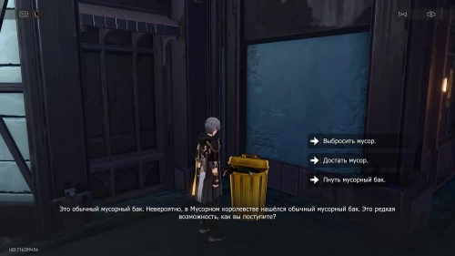 Подойдите к мусорным контейнерам, стоящим возле дальней стены, и взаимодействуйте с искоркой на них. Вы освободите Мусорского, который захочет вас убить. Можете ответить ему что угодно, так как он в любом случае уйдет. Затем пообщайтесь с баками-зеваками, чтобы получить от них доказательство.