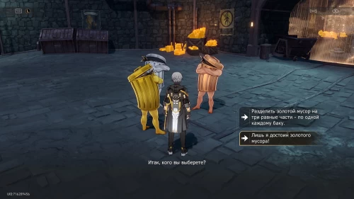 От предыдущего мусорного ведра поверните направо, и вы увидите на середине площади Мудрый, Серьезный и Красивый баки. Поболтайте с ними и выберите, кому отдать золотой мусор: поделить поровну или забрать себе. Опять же можете выбрать любой вариант (к сожалению, вы не получите мусор, даже если оставите его себе).