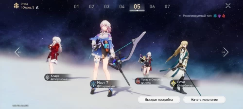 Вы тут же перейдете в меню настройки отряда. Игра советует взять в команду героев с ледяным, огненным и электрическим типами урона.