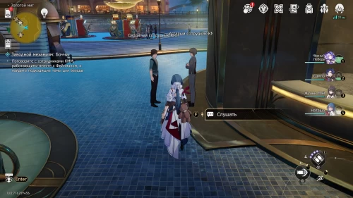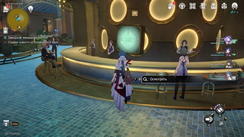Пройдите в самый центр выделенной области и отыщите рядом с барной стойкой двух сотрудников КММ. Затем выберите опцию «Слушать» для получения подсказки «Болтовня сотрудников».