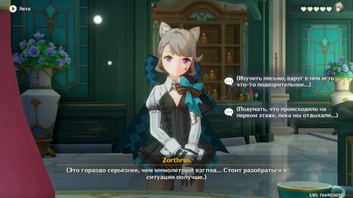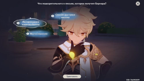 Решив скоротать время с Линетт, поднимитесь на второй этаж и подойдите к Фурине. Поболтайте с ней. Здесь вы впервые (если следуете нашему гайду) пройдете проверку проницательности и услышите странный звук позади собеседницы. Затем возвратитесь на первый этаж и заберите конверт со снимком.