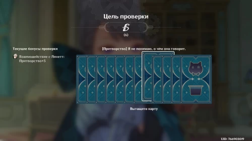 Во время разговора с Линетт, девушка попытается взять карту из шляпы, сделанной Фремине, однако ей не понравится полученный вариант, поэтому она предложит попробовать вам вытянуть карточку. Вам нужно будет ответить ей следующее: