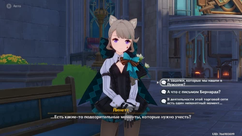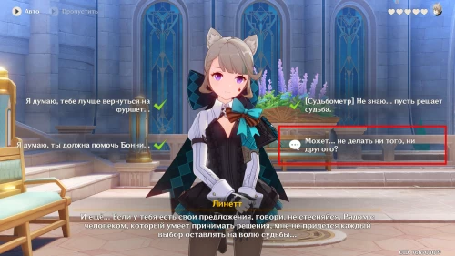 Затем дождитесь наступления завтрашнего утра, воспользовавшись часами в меню Паймон, встретьтесь с Линетт и пообщайтесь с ней (можете выбирать любые ответы). К вашей подруге придут двое горожан, которые будут утверждать, что именно им принадлежит кошка Бонни.