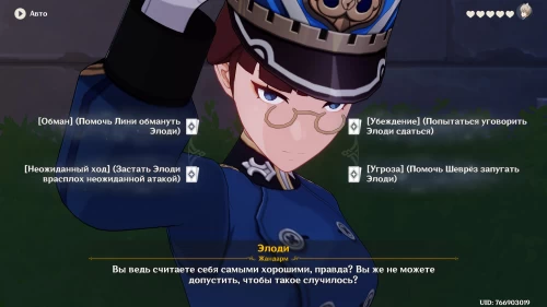 Далее при беседе с Элоди она откажется сдаваться и возьмет в руки пульт. Можете выбрать любой вариант для решения проблемы. Затем вытяните карту с цифрой от «15» и выше. В случае провала вам придется драться с жандарматонами.