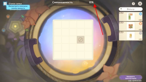 После краткого разговора с Лизой подойдите к трансмутационному котелку, чтобы сварить свое зелье. Дабы создать качественное снадобье, вам будет необходимо занять как можно большую площадь рабочего квадрата, расставляя на нем различные ингредиенты. Успех будет достигнут, когда показатель на шкале смешиваемости наверху будет не менее 100%.