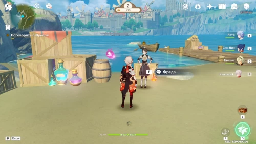 После работы с грядками Лиза отправит вас познакомиться с Фредой, ответственной за логистику. Она будет стоять на берегу. Осмотрите ассортимент ее магазина с ингредиентами.