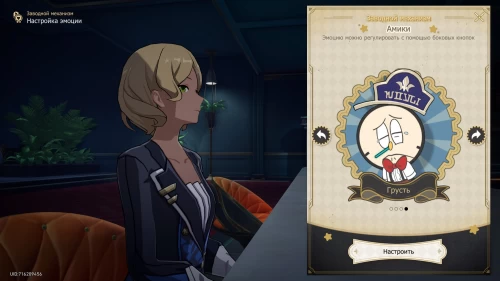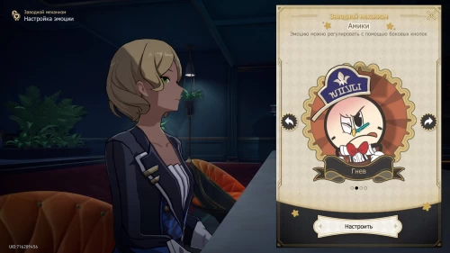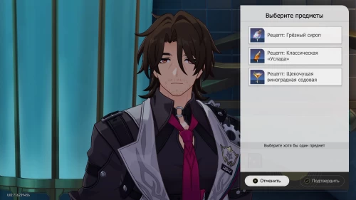 Взаимодействуйте с девушкой, сидящей за барной стойкой, и выберите вариант «Попробовать считать ее эмоции». Переведите ее эмоциферблат на «Гнев» и нажмите на кнопку «Настроить». Послушайте ее высказывания о клане Ирисов. Затем выберите эмоцию «Восторг» для получения рецепта «Щекочущая виноградная содовая».