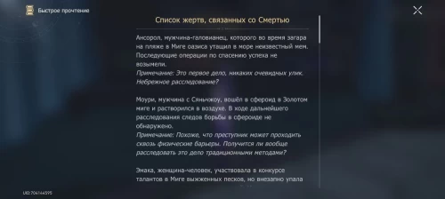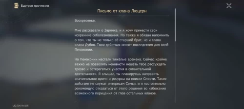 Пройдите к столу и изучите еще два документа: письмо от клана Люцерн и список подозреваемых в деле о Смерти.