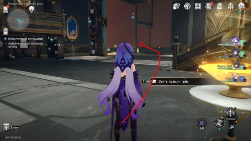 Возвратитесь в просторный зал и возьмите пузыри грез с золотой чаши в левой стороне помещения. Затем пройдите в правый угол, нажмите на кнопку и активируйте пузыремост с правой стороны, чтобы перейти на стену и открыть обычный сундук, победив перед этим нескольких противников.