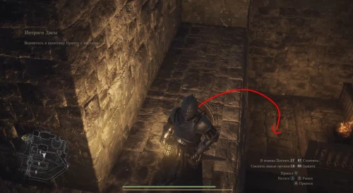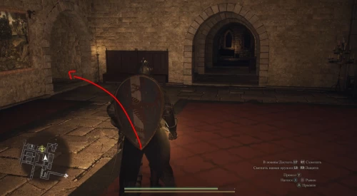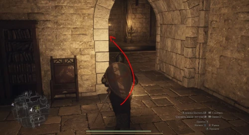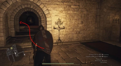 Теперь выйдите из караулки и сразу же поверните направо в просторный зал. Не задерживайтесь в нем, продолжая бежать вперед на другую сторону. Уже через пару секунд вы увидите впереди каменную лестницу – поднимитесь по ней на второй этаж замка.
