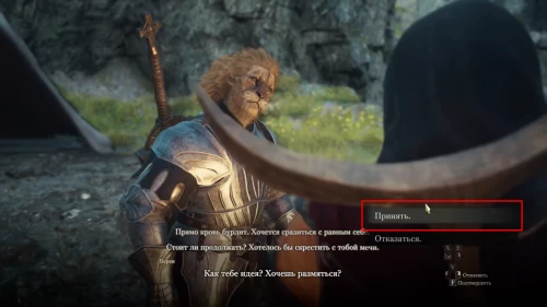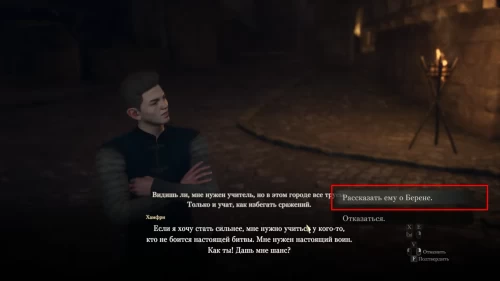 Когда Берен расскажет о тренировках новобранца, он начнет вспоминать былые деньки и решит устроить тренировочную схватку с вами. Далее события могут развиваться по трем сценариям, но какой бы из них вы ни выбрали, это не повлияет на дальнейший сюжет квеста.