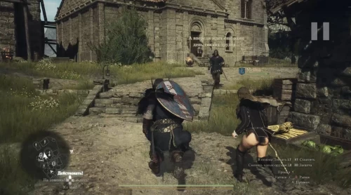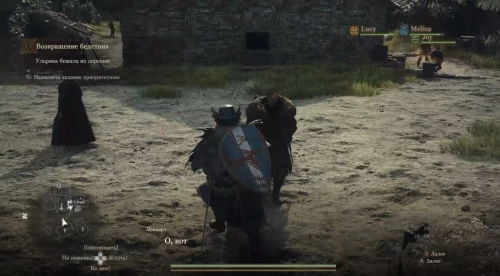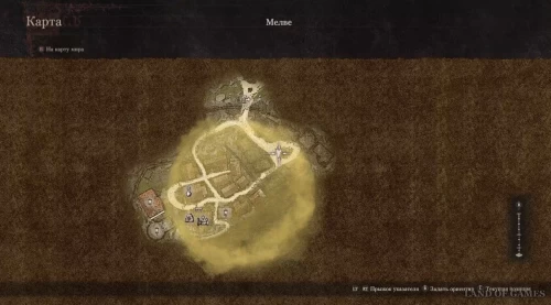 Здесь дождитесь повозку, заплатите извозчику 100 монет и отправляйтесь в деревню Мелве, где вы ранее уже бывали. Перед этим можете также взяться за выполнение квеста «Гонец на повозке», выдаваемого Донованом, стоящим рядом со столбом ожидания тележки. После прибытия в поселение, войдите в его разрушенную часть, и вы увидите, как местные сражаются с дрейком. После этого стартует соответствующая миссия. Правда, в вашем журнале квестов она пока что не отобразится.
