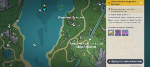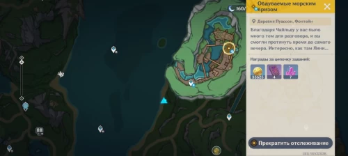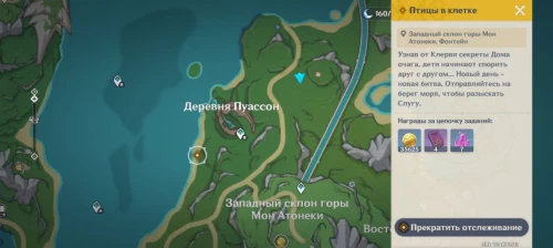 Отправляйтесь на побережье к югу от деревни. На железной площадке вы встретите Арлекино и Тарталью — он вернулся в Фонтейн, чтобы разыскать Скирк. Не найдя зацепок, он вынужден теперь вернуться на родину, для выполнения некоего проекта «Стужа».