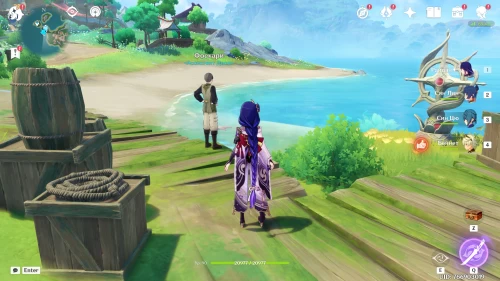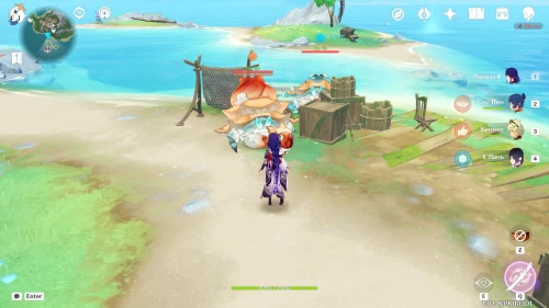 Отправляйтесь на южный берег Петрикора в точку, расположенную напротив двух маленьких островков. Там между ящиков и рыболовных сетей вы увидите грозно настроенных крабов, окруживших мужчину. Избавьтесь от опасных существ. Поскольку одно из них имеет пиро щит, то наиболее эффективно в борьбе с ними покажут себя гидро и крио герои.