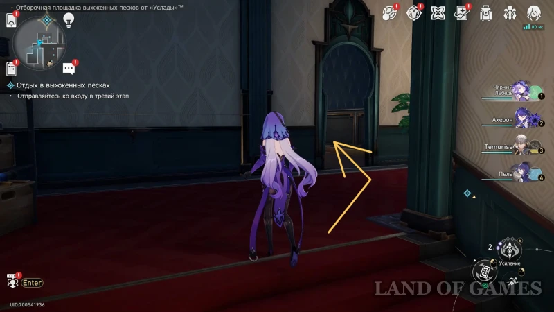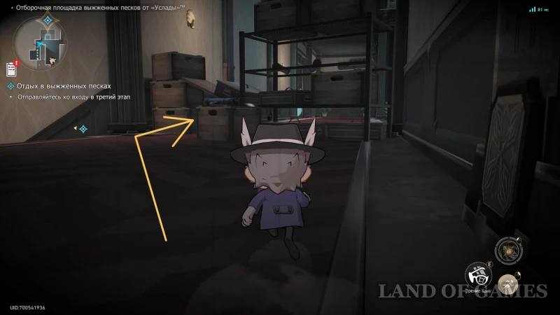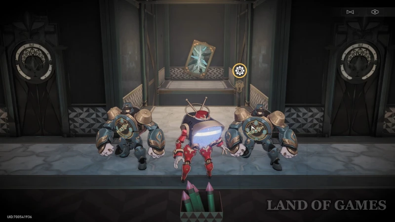 Пролезьте в комнату с испытанием Хану на втором этаже и сразу бегите к автомату в коридоре, ведущем на выход из карты, чтобы вернуть себе облик обычного героя. Снова вернитесь в зал и подойдите к картине-проходу (она находится за шахтой лифта и не должна быть перекрыта, если вы не забыли отогнать лифт на первый этаж). Телепорт приведет вас в закрытую комнатку с еще одной дверцей для гномика.