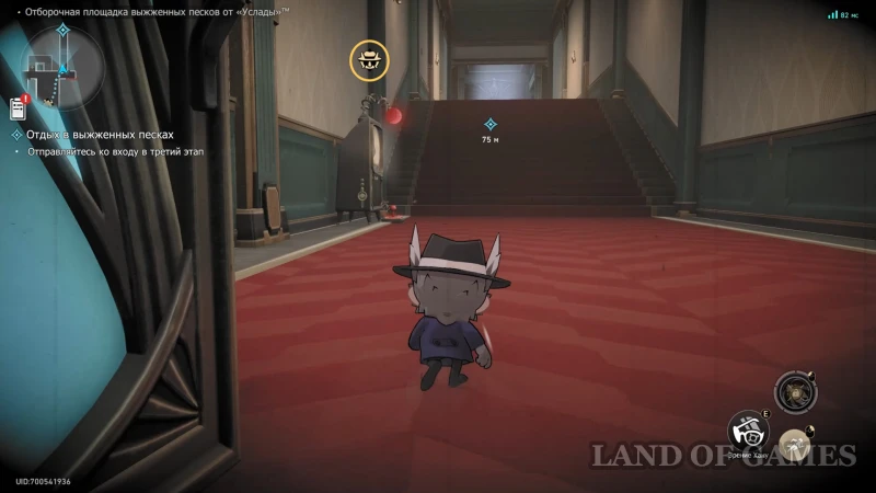 От якоря на юге особняка продвигайтесь прямо через проход, ведущий к залу первого этажа (если вы не открыли дверь ключом с обратной стороны, активируйте автомат Приключения Хану и пролезьте в дверцу для гномика). Далее поднимайтесь на второй этаж по лестнице пешком.