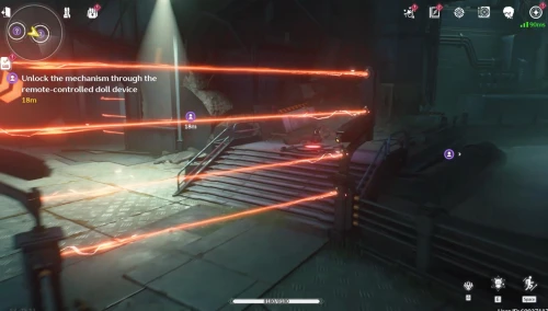 Бегите вперед, поднявшись по лестнице, а затем взаимодействуйте с консолью в форме глаза, чтобы получить контроль над куклой героини. Встаньте ею в центре площадки для отключения лазерных лучей. Нажмите клавишу «E», дабы вернуться к управлению персонажами.