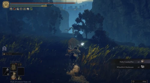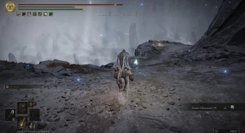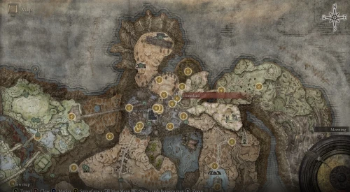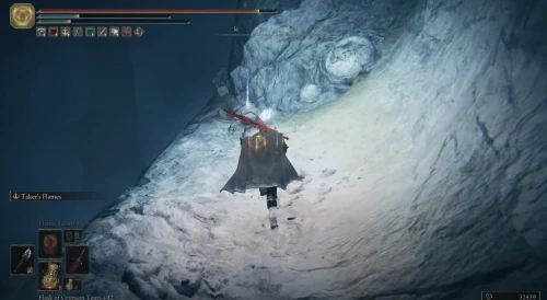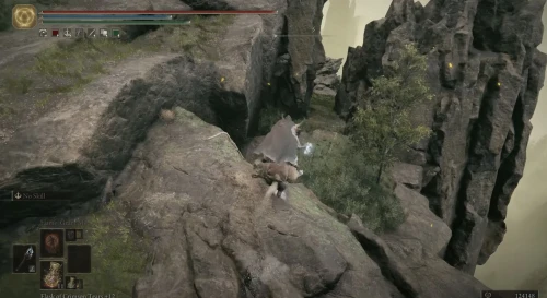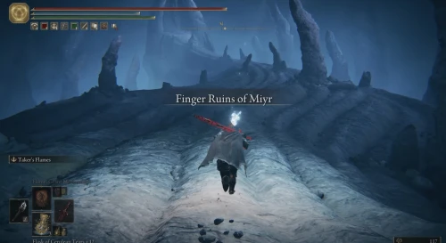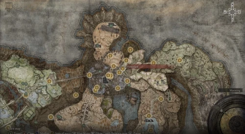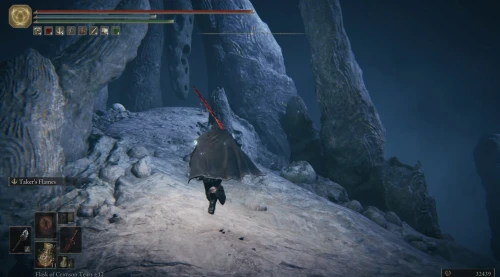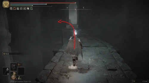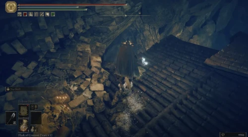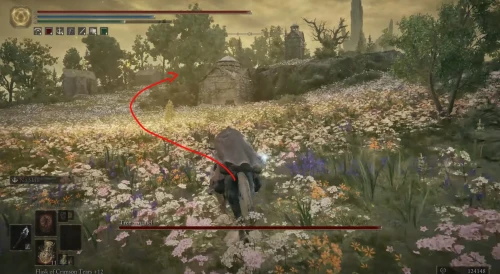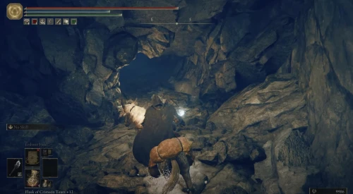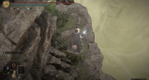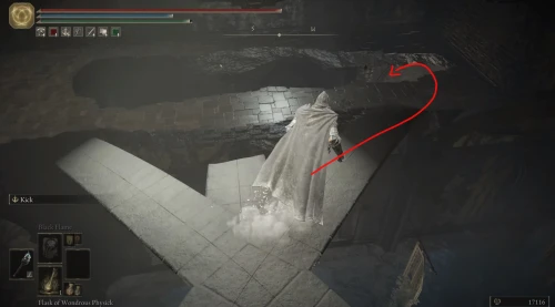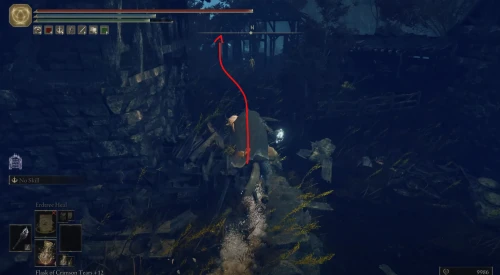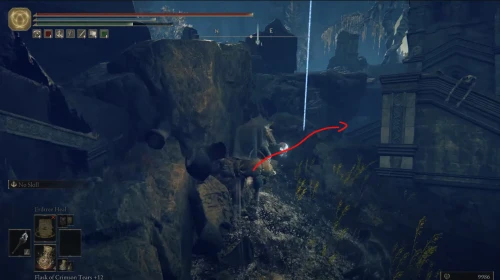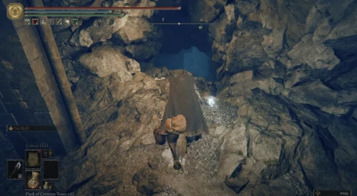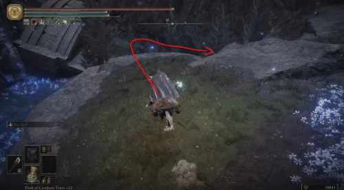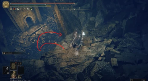 На развилке сверните вправо и начните двигаться в юго-восточном направлении, пока не доберетесь до места благодати «Руины Мурта». Оттуда продолжайте бежать строго на юг, пока не увидите среди руин небольшое ущелье, через которое вы можете спуститься вниз по уступам. Затем сразу же развернитесь, и вы увидите дыру в земле, ведущую в небольшую пещеру.