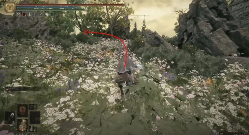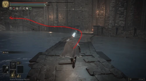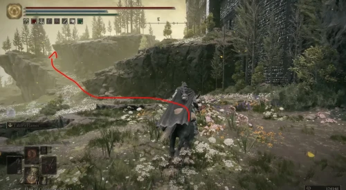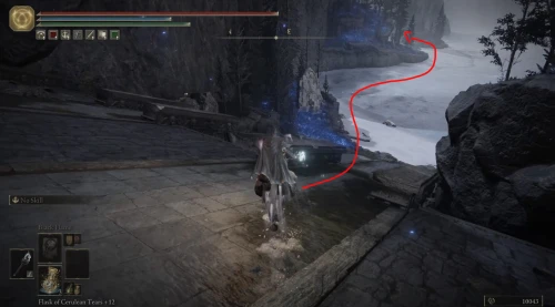 Заполучив карту, бегите на юго-восток, поднимитесь на склон, и вы доберетесь до места благодати «Крест на лазурном побережье». Затем начните двигаться на север, северо-запад, чтобы добраться до поваленного каменного здания – заберитесь на него и перейдите на другую сторону, а потом спуститесь вниз по склону и спрыгните на еще одно рухнувшее здание, по которому вы сможете добраться до берега.