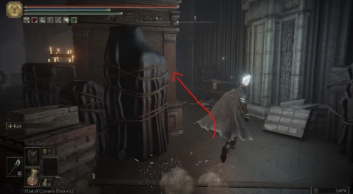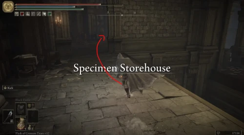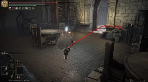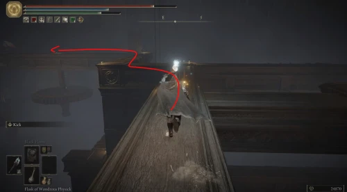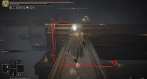 Поднявшись, сверните вправо и поднимитесь по ступенькам наверх. Далее пройдите между стеллажом и стеной справа, чтобы найти дыру в стенке – выйдите через нее наружу и тут же поверните направо. Бегите по деревянному помосту наверх и снова войдите в здание, чтобы активировать место благодати «Хранилище, чердак». Затем сразу же сядьте в деревянный лифт, который поднимет вас еще выше.