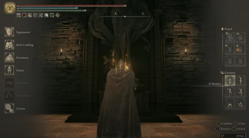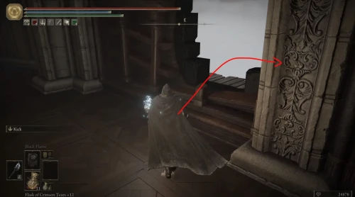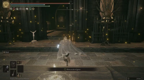 Если вы пройдете вперед, то вас ждет бой со сложным боссом, однако сражаться с ним необязательно. Пройдите в помещение справа от «костра» и подойдите к статуе, а затем выберите жест «О матерь», чтобы каменная фигура отъехала в сторону, открыв вам скрытый путь, ведущий к месту благодати «Внутренние земли» (Hinterland).