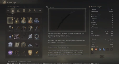 Если вы используете радужку тьмы, то получите Меч Ночи – это черная катана, урон которой зависит от Ловкости. Она способна накапливать кровотечение (45 единиц) и дает особый навык «Колдовской удар», позволяющий провести серию эфирных атак. Выглядит это оружие очень круто, однако урона наносит не очень много, поэтому мы все же советуем присмотреться ко второму варианту.