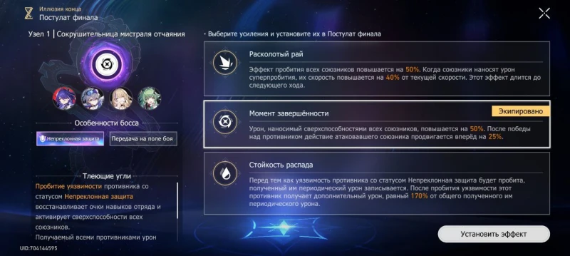 - Постулаты финала — усиления, которые вы можете выбрать для своего отряда. На выбор дается 3 Постулата, некоторые из которых баффают команду, другие — наносят дополнительный урон противнику или дебаффают его.