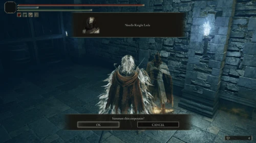 Взаимодействуйте с красным знаком призыва и помогите Леде расправиться с Ансбахом. В этом случае данный персонаж умрет, что приведет к завершению его квестовой цепочки, поэтому вы не сможете призвать его в двух битвах в Энир-Илиме и заполучить несколько ценных предметов.