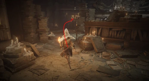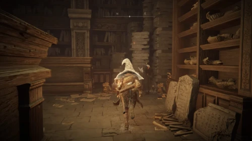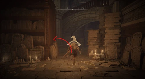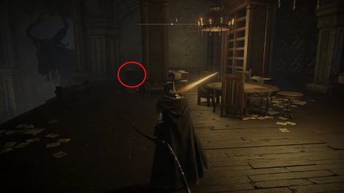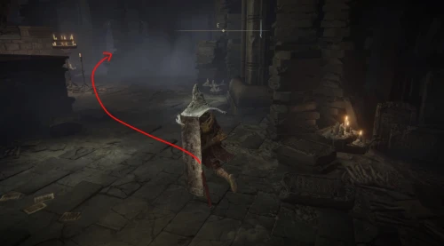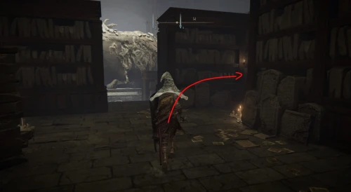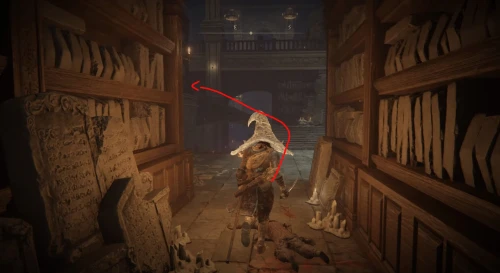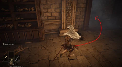 Для этого первым делом доберитесь до места благодати «Хранилище, первый этаж» (мы в деталях рассказали о том, как попасть туда в гайде по поиску Радужки благодати 1). Активировав «костер», сверните в проход справа, а потом пролезьте через книжные полки в помещение на севере.