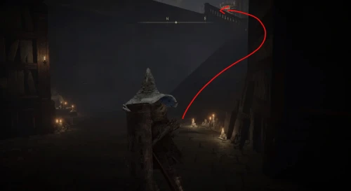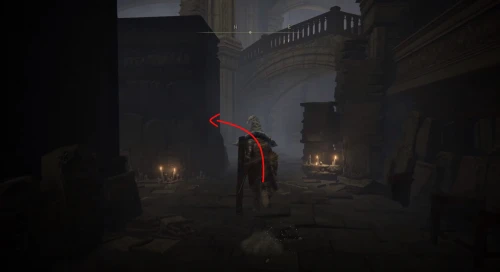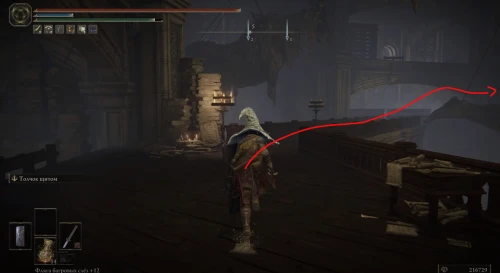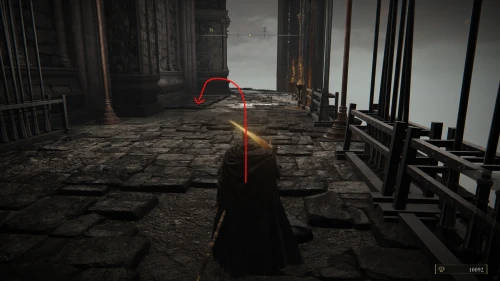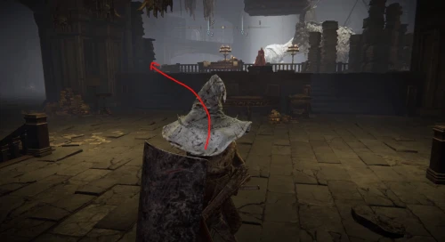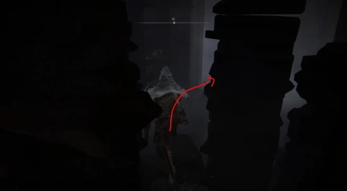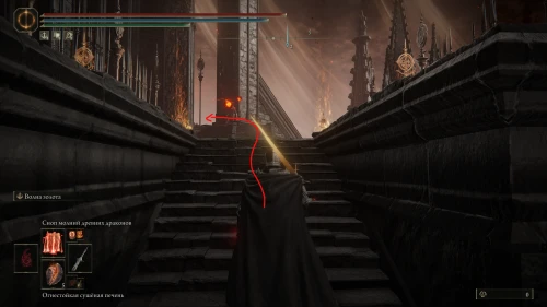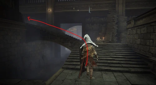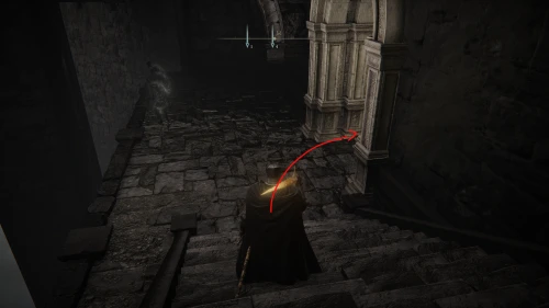 Вернитесь к месту благодати «Хранилище, четвертый этаж», а затем выйдите на балкон и сверните влево. Поднимитесь по каменной лестнице, пройдите мимо двух огней, разберитесь с красным рыцарем и взберитесь по еще одной лестнице. Двигайтесь по каменной площадке вперед, а потом поверните влево и спуститесь по ступенькам вниз.