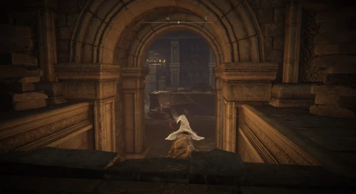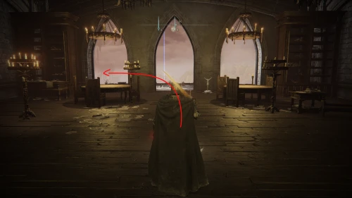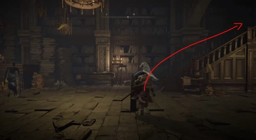 Пробегите мимо книжных полок, сверните вправо и поднимитесь по лестнице вверх. Оказавшись на новой площадке, воспользуйтесь лесенкой справа, чтобы подняться еще выше. Добравшись до верхнего уровня, пройдите в центр зала по ступенькам, обойдя или победив огненного рыцаря. Далее пройдите по деревянному мостику на юг и запрыгните на подвешенную к потолку статую.