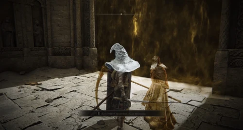 Взаимодействуйте с золотым знаком призыва и помогите Ансбаху победить Леду. В этом случае вы получите в награду Руну Леды, Длинный лук Ансбаха и пепел войны «Быстрый удар». К тому же квестовая цепочка Ансбаха продолжится, что позволит вам получить в будущем еще более ценные вещички.
