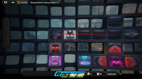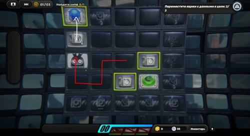 Первым делом вам необходимо будет решить небольшую головоломку, передвинув металлические ящики на клетки с синими кнопками. Если вы окажитесь в безвыходной ситуации, то встаньте на зеленую кнопку для сброса загадки.