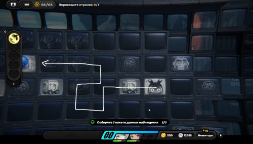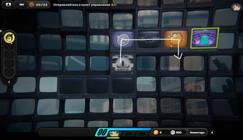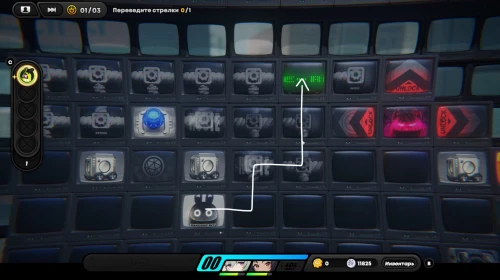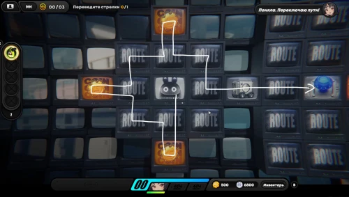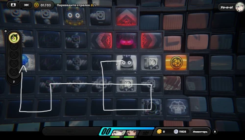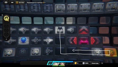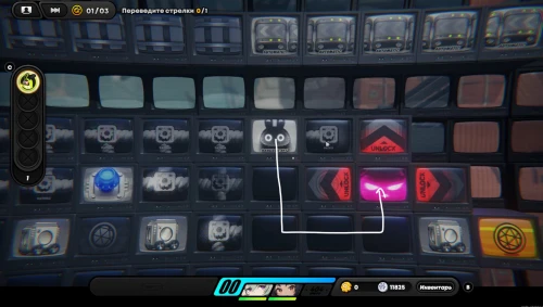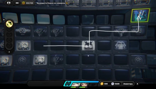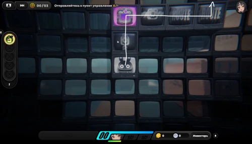 Вначале соберите шестерлинги слева, вверху и внизу, а потом подвиньте куб вправо, чтобы разместить его на первой синей кнопке, как продемонстрировано на скриншоте ниже. Далее пройдите к клетке события справа и внизу (перед этим соберите пакет с данными возле кнопок), чтобы запустить встречу с Корин.