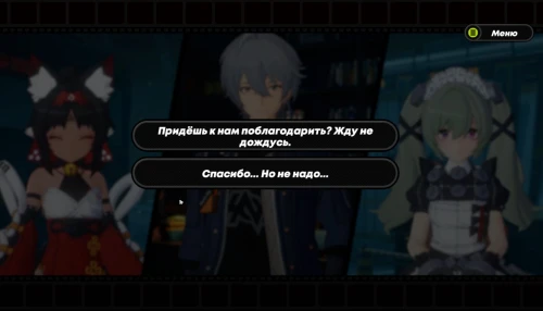 Двигайтесь вправо и наверх и встаньте на подсвеченную зеленым цветом клетку. Тем самым вы поможете Корин выбраться из каверны. Во время последнего диалога можете отказаться от ее предложения или сказать, что вы не против того, чтобы она пришла к вам. В последнем случае Нэкомата будет возмущена тем, что мы так быстро доверились горничной.