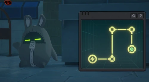 После выполнения заказов поговорите с братом и сестрой, а затем познакомьтесь с Инспектором Мяучело и согласитесь помочь ему. Вам предстоит отыскать сломанного банбу – он находится позади киоска с билетами, рядом с мусорным контейнером. Взаимодействуйте с потеряшкой и решите головоломку со схемой, повернув логические элементы так, как показано на втором скриншоте ниже.
