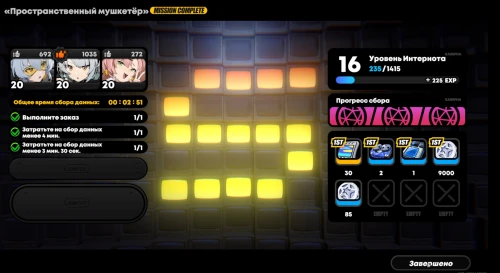 Далее взаимодействуйте с системой HDD, перейдите в раздел боевые заказы и возьмитесь за прохождение миссии «Пространственный мушкетер». Ваши агенты должны быть не ниже 14-го уровня и относится к Электро атрибуту. Подойдет тот же отряд, что мы советовали взять в предыдущих боях.