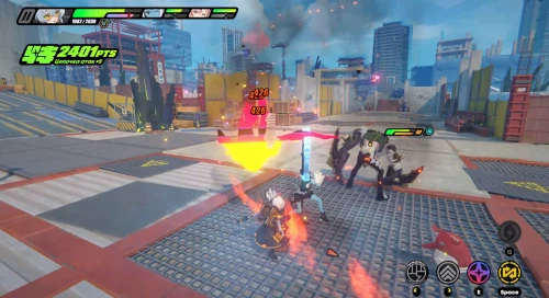 Пройдите вперед и расправьтесь с первой группой врагов. Затем поднимитесь наверх и уничтожьте вторую пачку мобов. Далее пройдите налево и разберитесь с новыми монстрами – Заряженными сатирами, которые могут выпускать лазерные лучи. Они уязвимы к огненным атакам. После их уничтожения появится сильный враг с двумя лезвиями. Советуем вам использовать на нем ульту, если вы успели накопить децибелы.