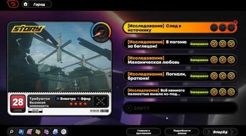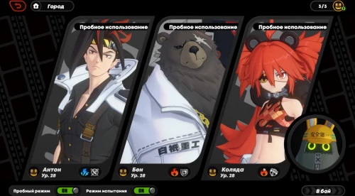Игра посоветует вам взять эфирных и электрических персонажей не ниже 28-го уровня, предупредив о Высокой опасности. Впрочем, здесь будет активирован Пробный режим, позволяющий сыграть за уже прокаченных героев, даже если их нет в вашей коллекции. В этой миссии удастся опробовать Антона, Коляду и Бена.
