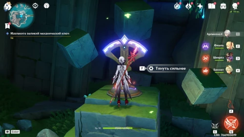 Когда незнакомцы перестанут говорить, поднимитесь на выступ на севере и отыщите здесь механический ключ, на который будет указывать маркер. Выберите опцию «Тянуть», однако вам не удастся его вытащить. Затем стукните его пару раз обычным ударом (ЛКМ), пока не появится надпись «Тянуть сильнее» и нажмите на нее.