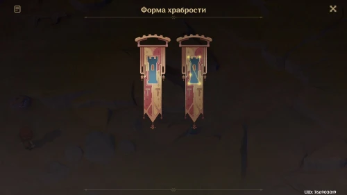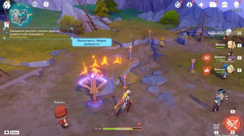 Завершив диалог, вы тут же переместитесь на поверхность, где на вас нападет группа хиличурлов. Разберитесь с ними, после чего Каппет продемонстрирует вам знамя своего клана «Форма храбрости». Именно его вам предстоит повторить с помощью столпов оракула (на картинке показано, какие столбы нужно соединить друг с другом).