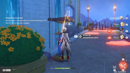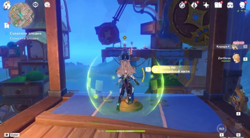 Первым делом используйте умение Кирары, долго нажав на «Е», чтобы она превратилась в кошку, а затем начните забираться на стену, следуя за золотым потоком. Сверните влево и воспользуйтесь столпом оракула (нажмите «Т»), чтобы перелететь на другую сторону, однако точно подберите момент, чтобы маятник не срезал вашу нить.