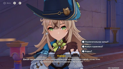 После нахождения всех улик, подойдите к Кираре и пообщайтесь с ней. Далее она спросит вас, какое оружие использовал злоумышленник. Правильный ответ следующий: