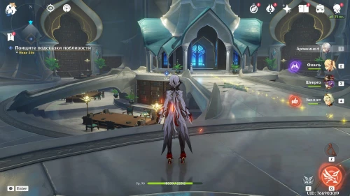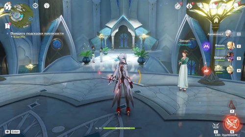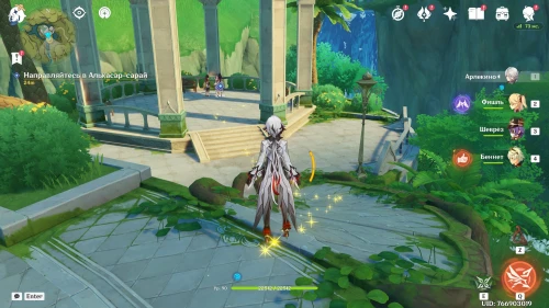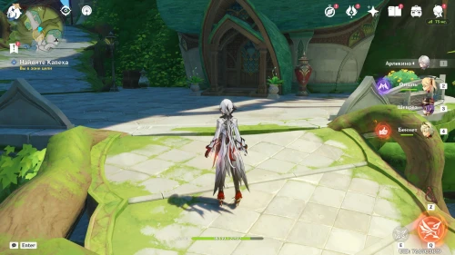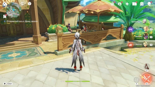 Вновь возвратитесь в Дом даэны, после чего тут же стартует ролик. Вы встретите Нахиду, которая посоветует вам отправиться в Алькасар-сарай. Переместитесь во дворец и пройдите в каменную беседку, где вы встретите Сайно, Сетоса и Дори.