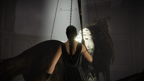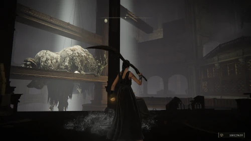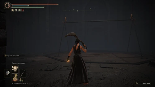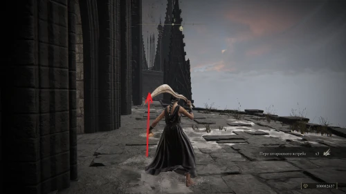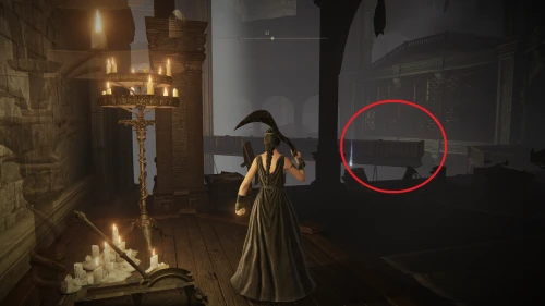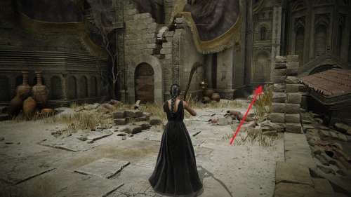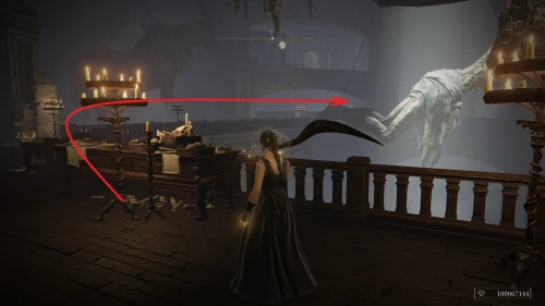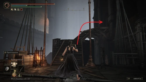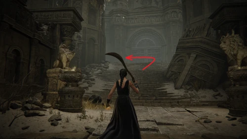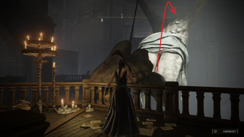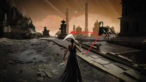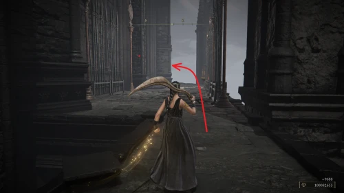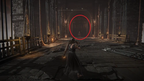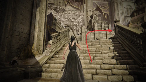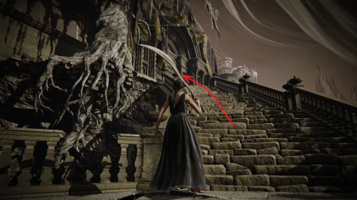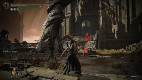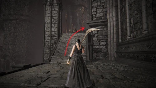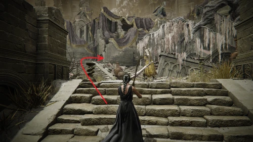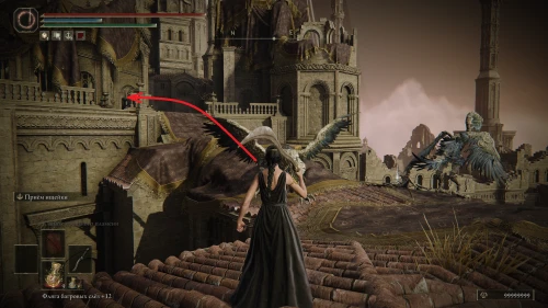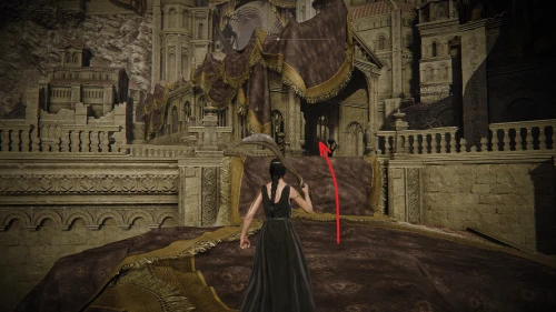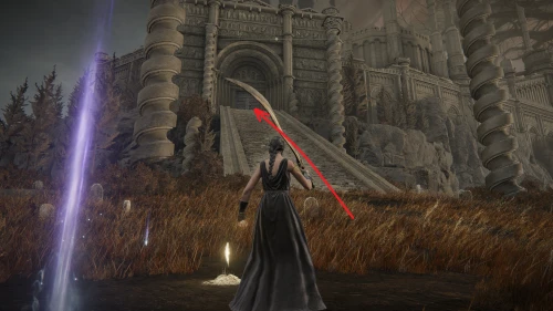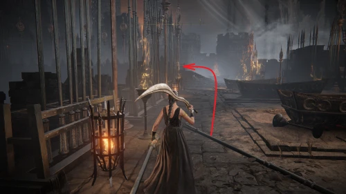 Заберитесь на спину первому чучелу, затем запрыгните на следующее и спуститесь с него на балкон. Снова выйдите наружу и поднимитесь по лестнице, пока не увидите Красного рыцаря и огромную дверь, за которой скрывается вход к месту битвы с Мессмером. Победите рыцаря, заберите с него Шлем с крылатым зверем и Пепел войны: Полыхающее копье.